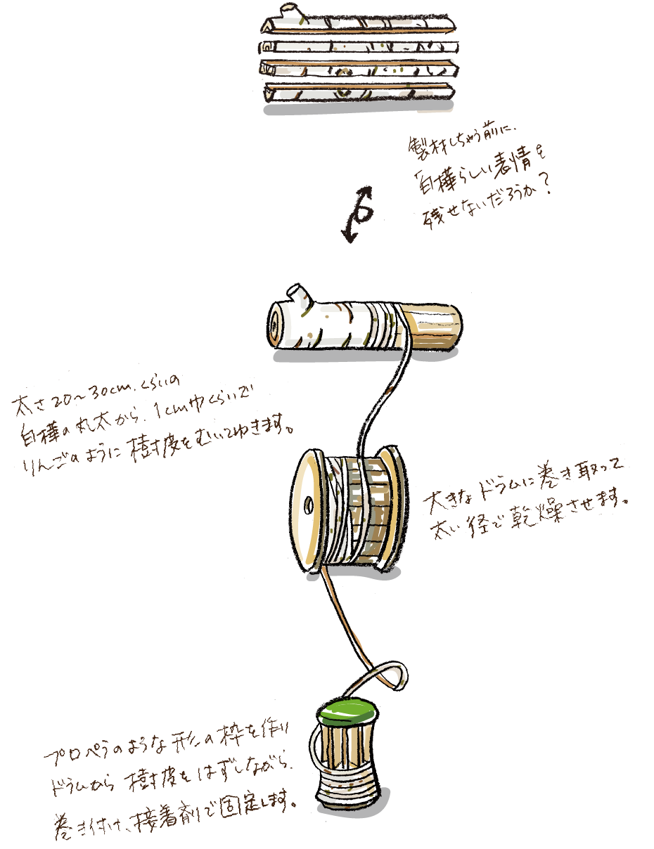 北海道の森の中でも身近な白樺は、木一本まるごと利用でき、荒地にも50年で育ち、北方圏の多くの民族で使われ続けてきた持続可能な資源。たくさんある樹種の中の単なる選択肢の一つではなく、ずっと使い続けることにより、林業から始まる森と人との適正な営みの中で、暮らしの道具を作り、届けたい。