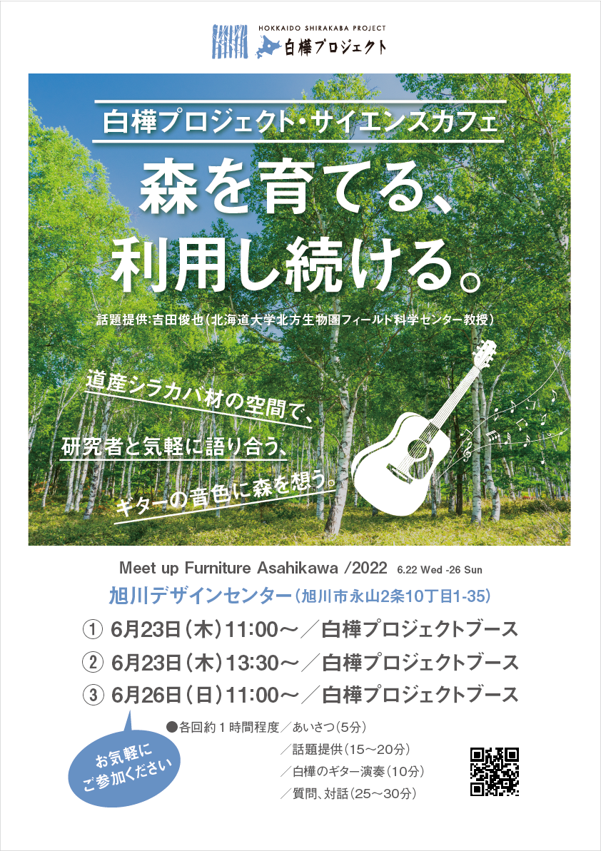 林産試験場の秋津研究員からは、「なぜ楽器に、木が使われるのか?」白樺でギターを作ってみては?と考えた経緯が話され、家具デザイナー朝倉さんの白樺ギター演奏に、初夏の森の風を感じました。朝倉さんからは、白樺ギターの特徴や3年経った(育てた)音色の変化のお話などもありました。