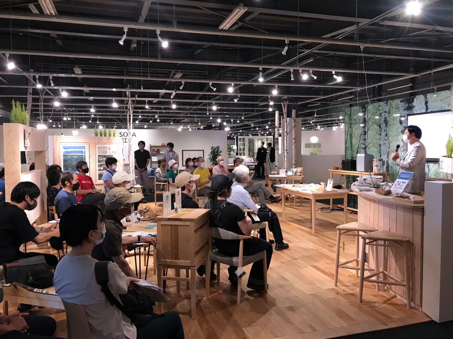 吉田教授からは、北海道の人工林のほとんどが針葉樹であること。家具などに使われる広葉樹の人工林はほんの数パーセントしかないこと。その中でも、ミズナラなどに代表される、陰樹と呼ばれる陽陰を好む樹種の人口育成のむづかしさの反面、白樺などの陽樹と呼ばれる、明るいところを好む樹種の育てやすいというお話を伺いました。白樺利用の有用性が示されました。