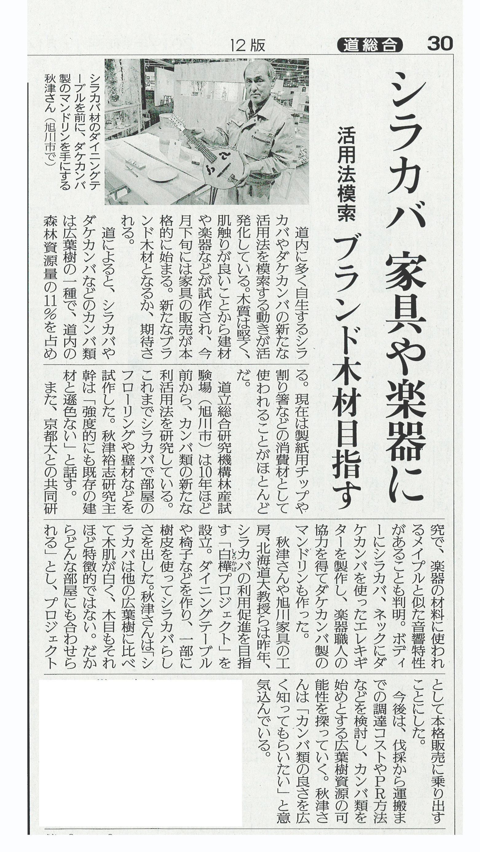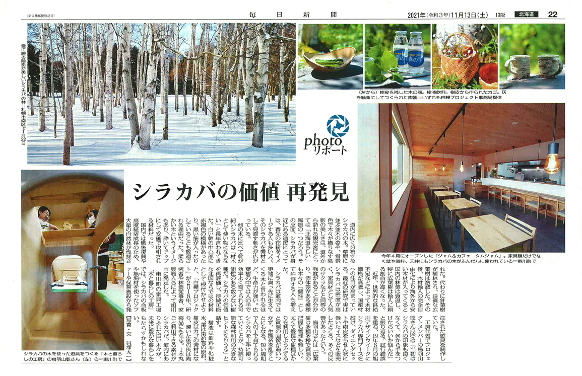 メディア(媒体)掲載 数々の媒体に取り上げていただきました。 〈 PDFダウンロードができます 〉 令和6年度森林・林業白書 道産白樺材を内装材や家具材に活かす取組.pdf ウッドデザイン賞 2024.pdf 木材情報2024-11月.pdf 林政ニュース730号.pdf 202400627-道新旭川版.pdf 20240402-東京新聞(共同通信).pdf 20231126-日経-森に眠る宝.pdf 2023 森林総研 No-26.pdf 20221015-サタデー道新.pdf 20220708-道新.pdf 20220525-スロウ.pdf 20220227-道新朝刊(旭川版).pdf 20220225-道新朝刊(旭川版).pdf 20211113-毎日新聞(北海道).pdf 20210424-道新朝刊(旭川版).pdf 北海道の自然-No59に寄稿しました.pdf 20201212-朝日(道内版).pdf HO〝ほ〟’20-6.25発売pdf 北海道住宅通信-’20.3.35.pdf スロウ-vol.62.pdf 20200122-道新朝刊.pdf 20200106-道新朝刊.pdf 20200101-北海道経済.pdf 20191114-読売(道総合).pdf 20191023-道新夕刊.pdf 20190915-道新朝刊.pdf 20190629-道新朝刊.pdf 20190628-道新朝刊.pdf 20190626-朝日(道内版).pdf 20190617-道新夕刊.pdf